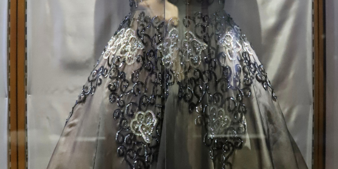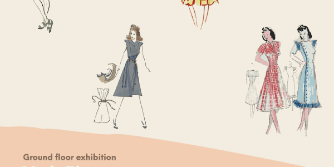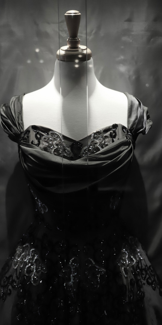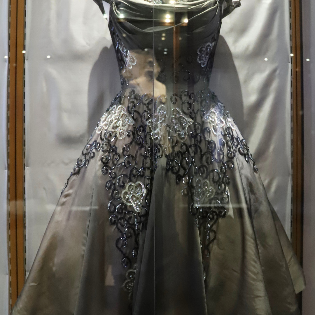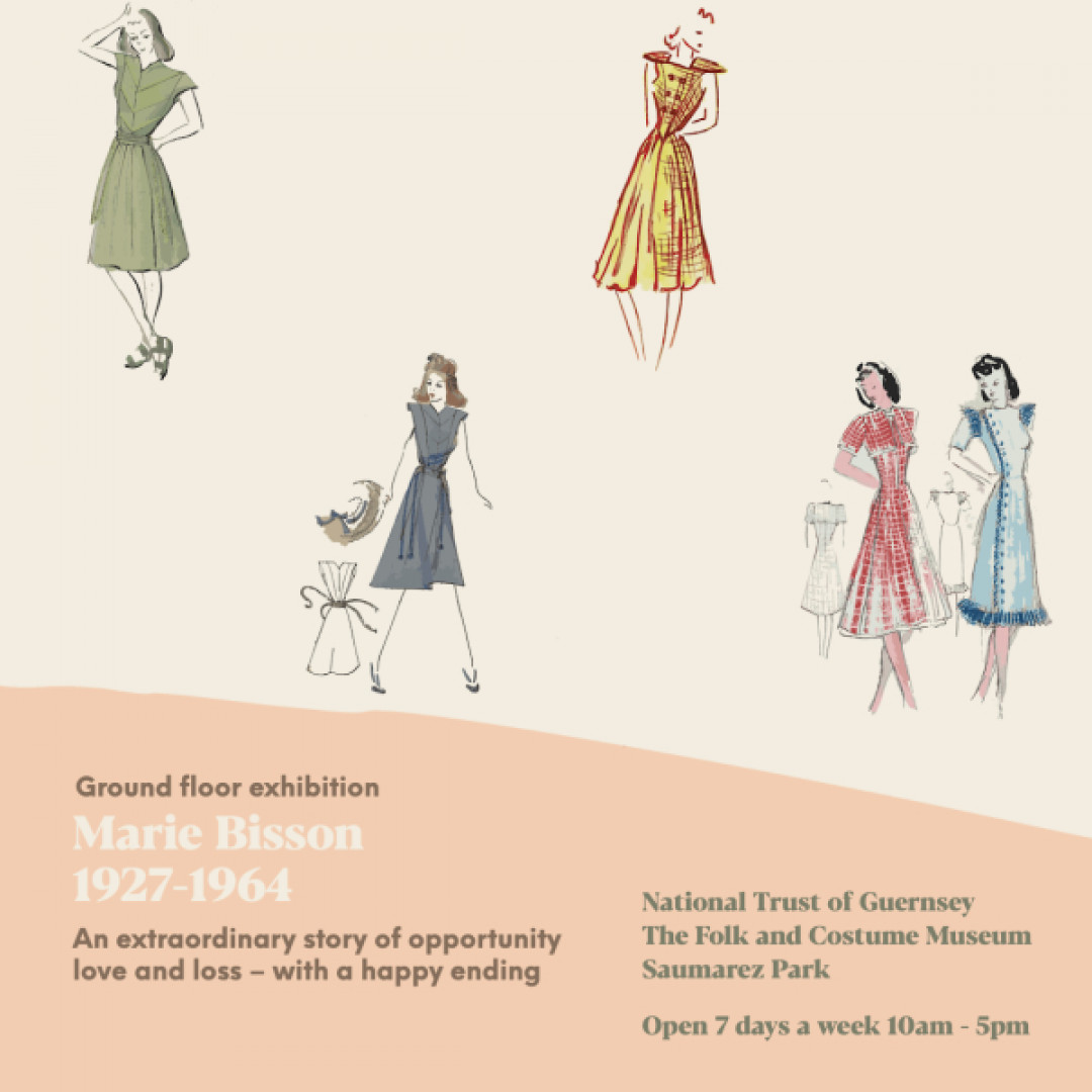 The ground floor costume exhibition is dedicated to the work of local artist and designer Marie Bisson (1927 – 1964). Commissioned by the States of Guernsey to organise costumes Guernsey's 1953 Coronation Pageant, Marie's work is displayed through original sketches, illustrations and correspondence of the time. Garments designed and created by Ms Bisson are displayed, notably her wedding dress reflecting the glittering beadwork style of the day influenced by Norman Hartnell's 1953 gown designed for the coronation of Queen Elizabeth II.