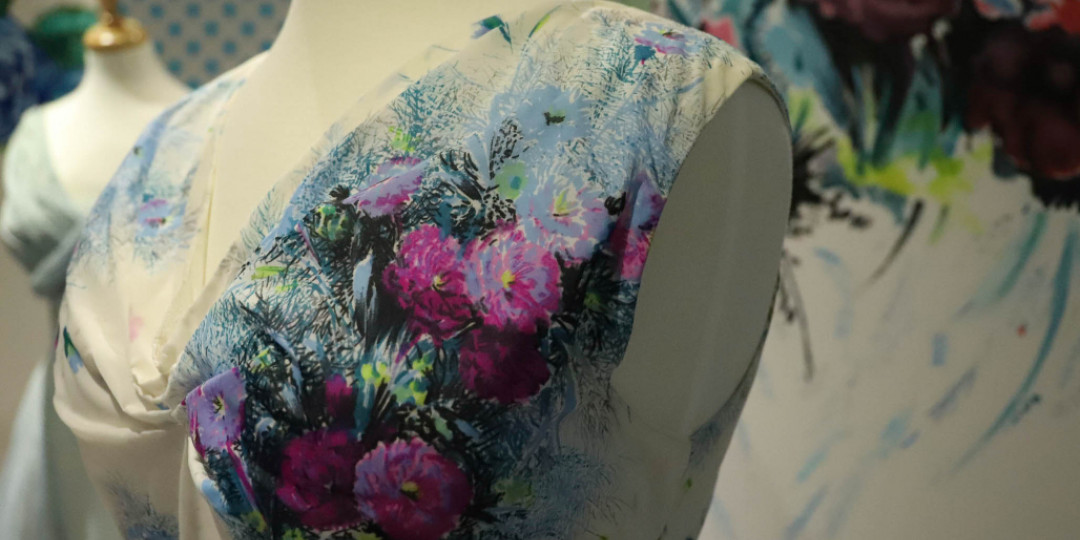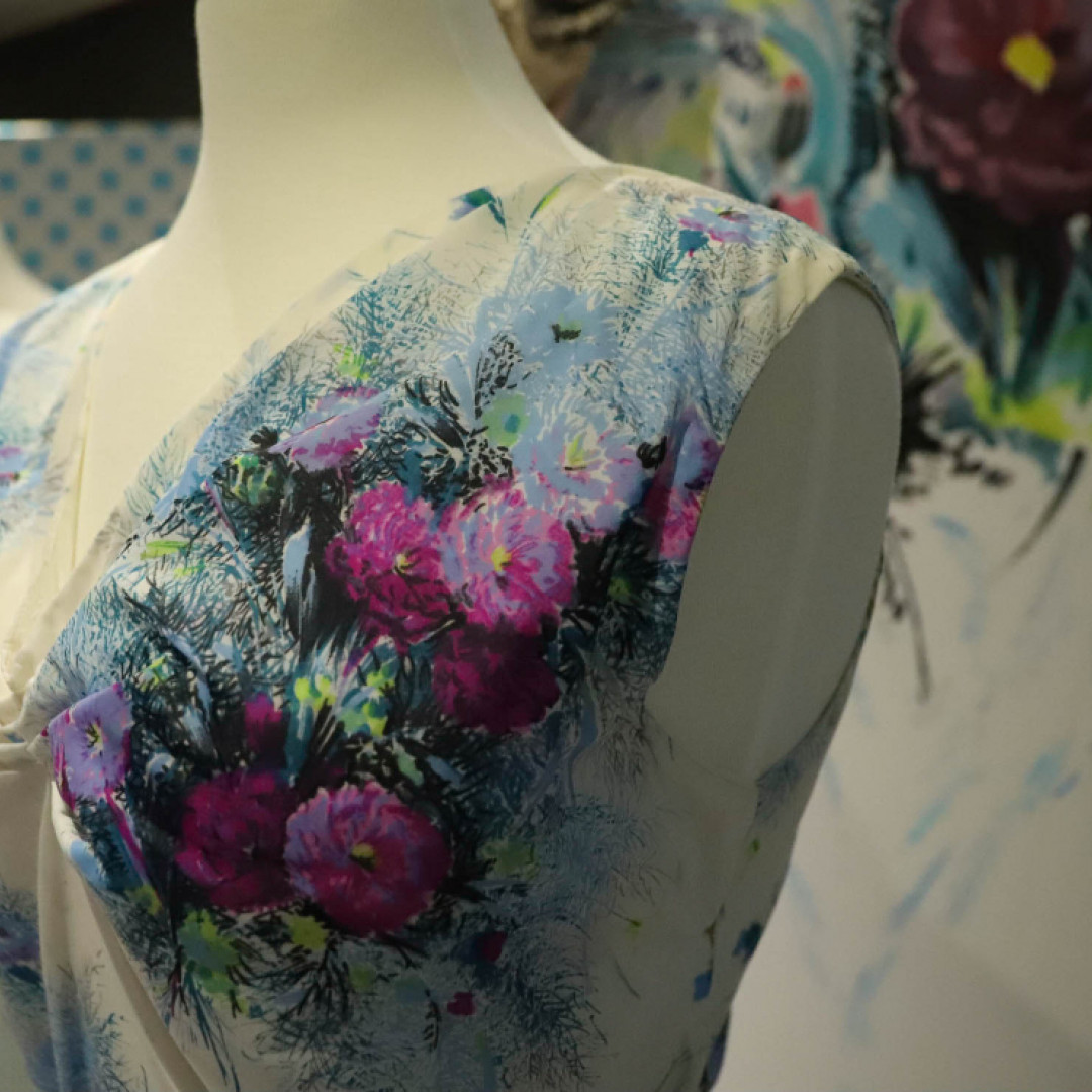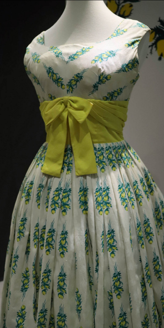 The first floor '1950 Night and Day' exhibition reflects the 'New Look" with fabric, colours and prints showing a positive rainbow of colour for the night time look and pretty prints for day time dresses.