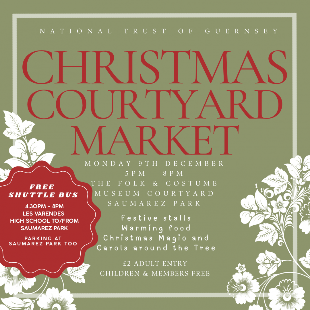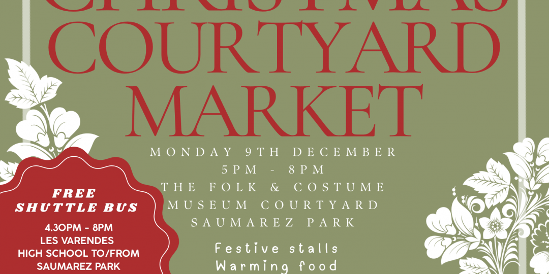 The much-loved Christmas Courtyard Market takes place on Monday 9th December and this year, we are offering a free shuttle bus service from 4.30pm to 8pm between Les Varendes High School lower car park and Saumarez Park. There is parking at Saumarez Park, but it is limited, so please make use of this jolly fun bus if you can. More details of the Christmas Courtyard Market will follow, but please make a note in your diary and come and join us singing carols around the courtyard Christmas tree and mooching through some lovely artisan stalls.