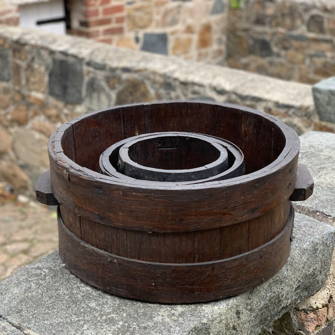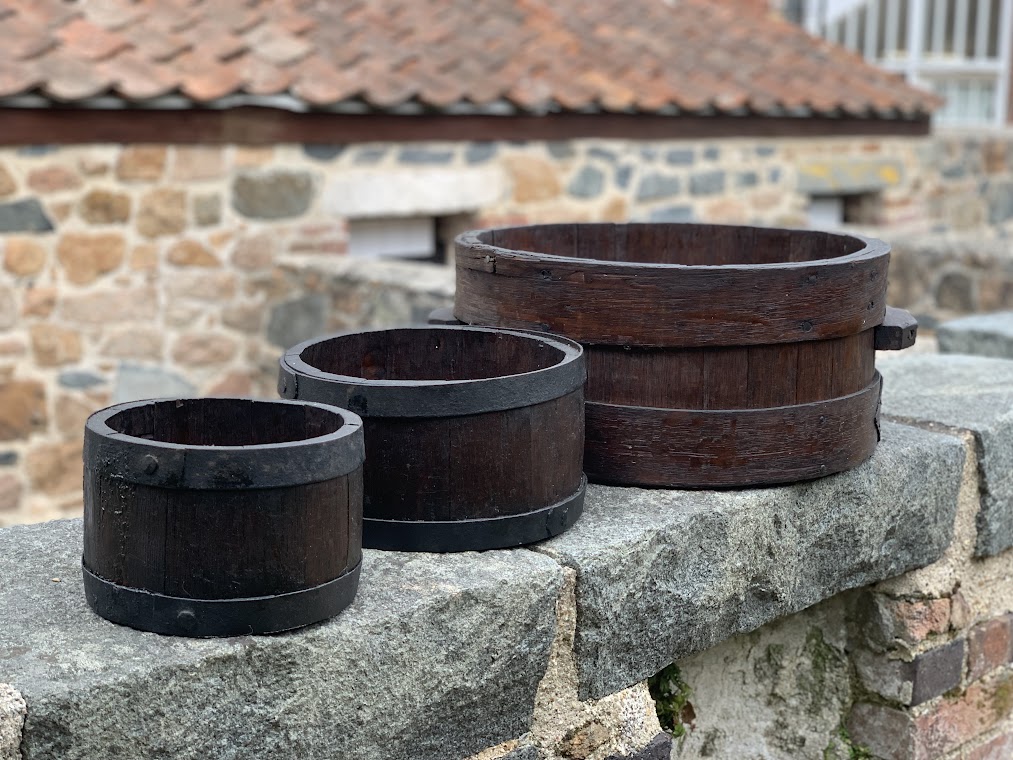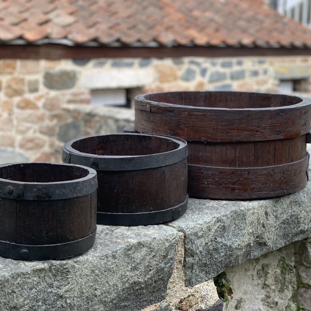 They are corn measures, simple open containers made of wood with metal bands, used for measuring dry goods by volume. The largest of these three measures is sized to hold a bushel (buissé) of wheat, a little less than 6 gallons imperial or 27 litres metric; the next smallest is the deneral (dén’raï), one sixth the size of the bushel; and the smallest is the half-deneral (d’mi-dén’raï), one twelfth of a bushel. A wooden tool called a strike or strickle was used to ensure fairness and accuracy. The strike was used to level off the wheat, which had been pressed into the measure with both hands.