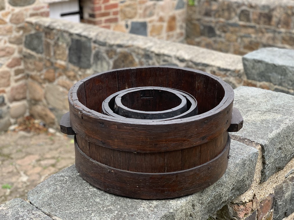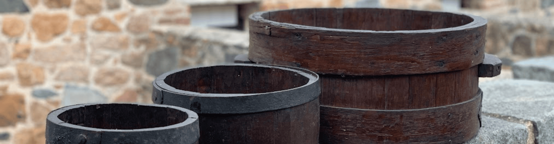 These measurements are mentioned as early as the 13th century and do not completely correspond to the system of any other region. Although their precise values changed over the centuries, the States closely dictated the proper shapes and sizes for measures, and those which had been inspected and approved on behalf of the Royal Court were stamped with insignia. The bushel measure in the Museum collection has such a stamp, in the form of three lions; if the measure were improper, its use would have been legally penalised.