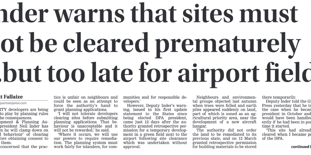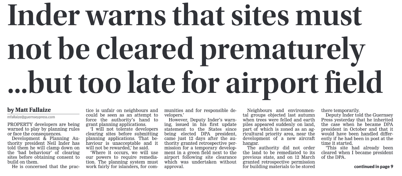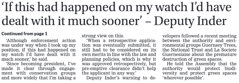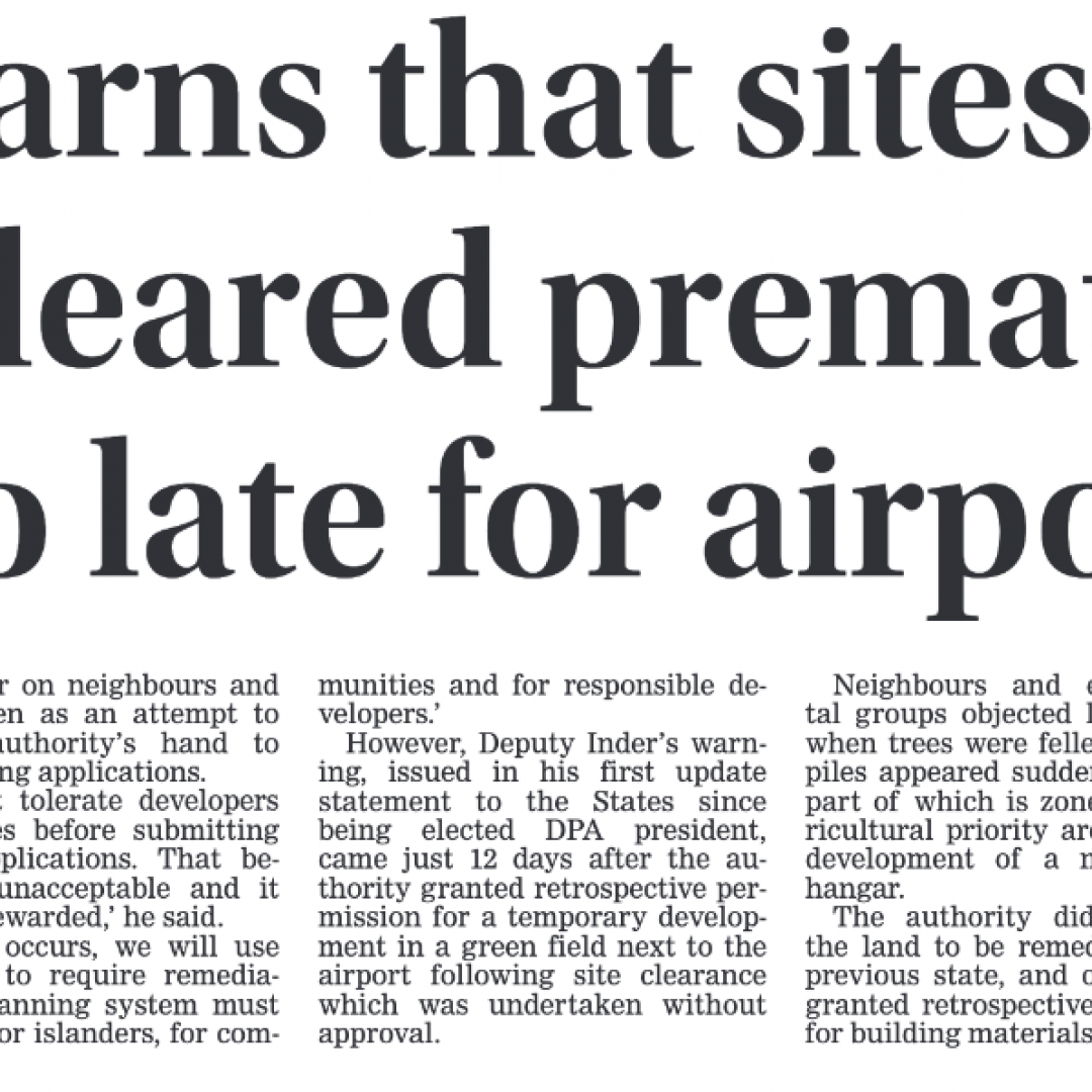 Apropos headline news in the Guernsey Press Saturday 28 March 2026, we are encouraged to see clear messaging from Deputy Neil Inder that the premature clearance of land ahead of planning applications will not be tolerated within the planning process. This is an important and welcome step.
