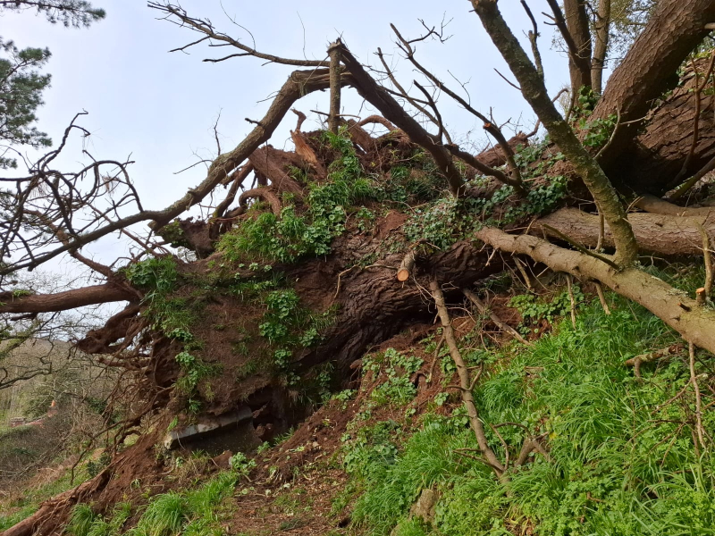 Unfortunately, the direct route upwards from the small car park will probably remain closed for about six months, as steps lifted by fallen tree roots, need to be rebuilt. There is a possibility that the path may need to be re-routed, but we await the advice of tree surgeons before planning the work.