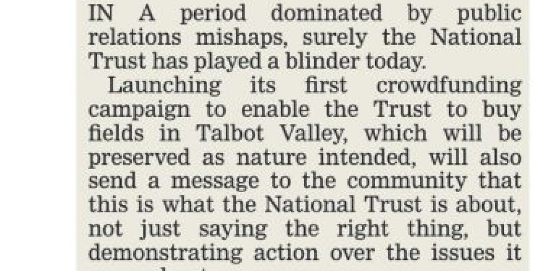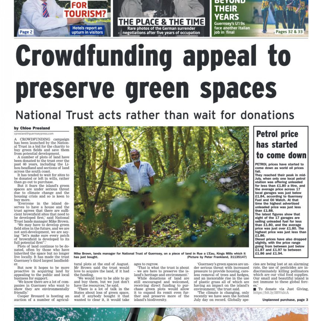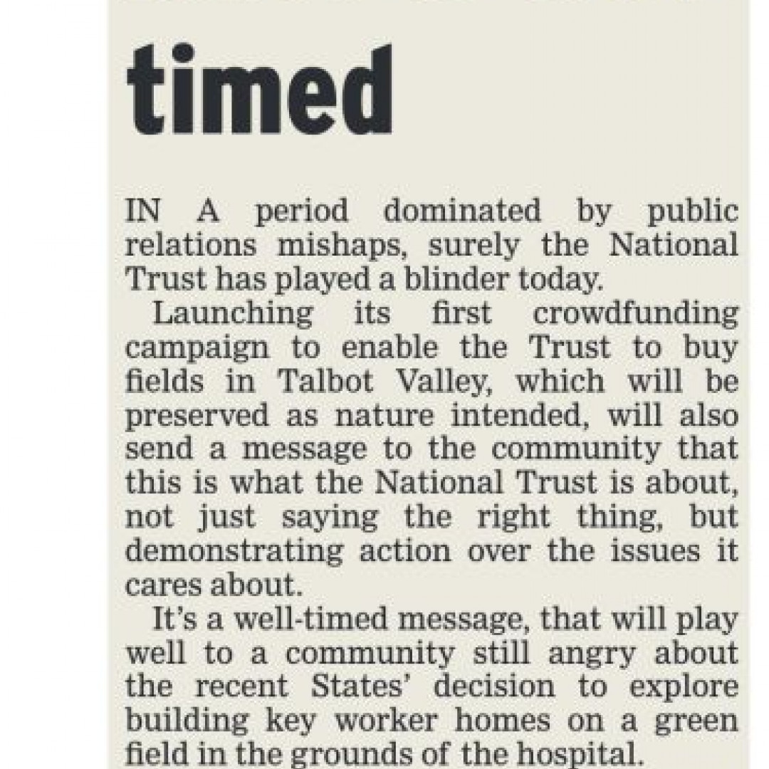 Thank you to Guernsey Evening Press for publishing Talbot Valley land acquisition news so accurately and with great prominence. The Opinion column eloquently indicated our call to arms for Islanders to urgently get on board land preservation, independently and away from the push and pull of States deliberations.
